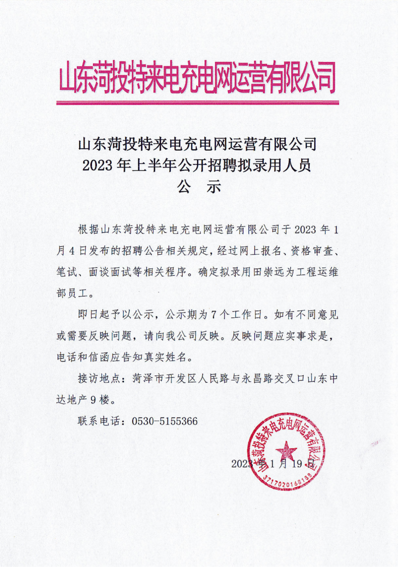 山东菏投特来电充电网运营有限公司2023年上半年公开招聘拟录用人员公示